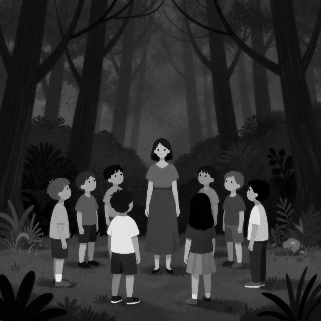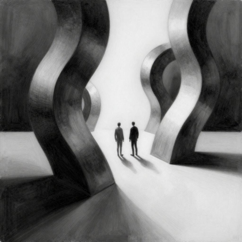 Black-and-white digital drawing of two humanoid figures standing in a surreal, shadowy room with large, oval, glowing lights on the wall. The taller figure wears a striped shirt and black pants, while the shorter figure wears a dress and striped socks. A large, robotic arm with circular patterns is on the left.