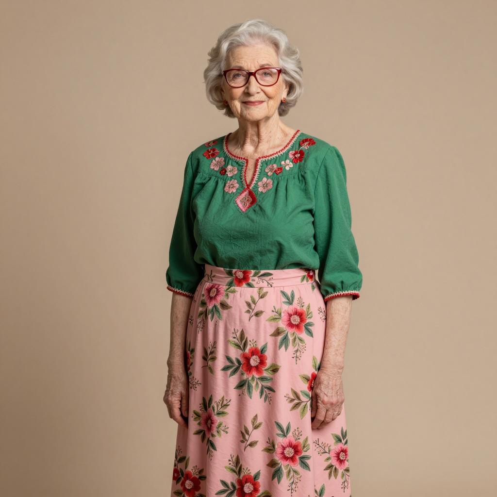Dress like old lady fancy, photograph of elderly woman, light gray short hair, red glasses, green blouse with red and pink embroidered details, long pink floral skirt, standing, neutral beige ured background, portrait style, soft lighting, realistic, gentle smile, hands relaxed by sides, vintage clothing, soft focus, warm tones, realistic ure