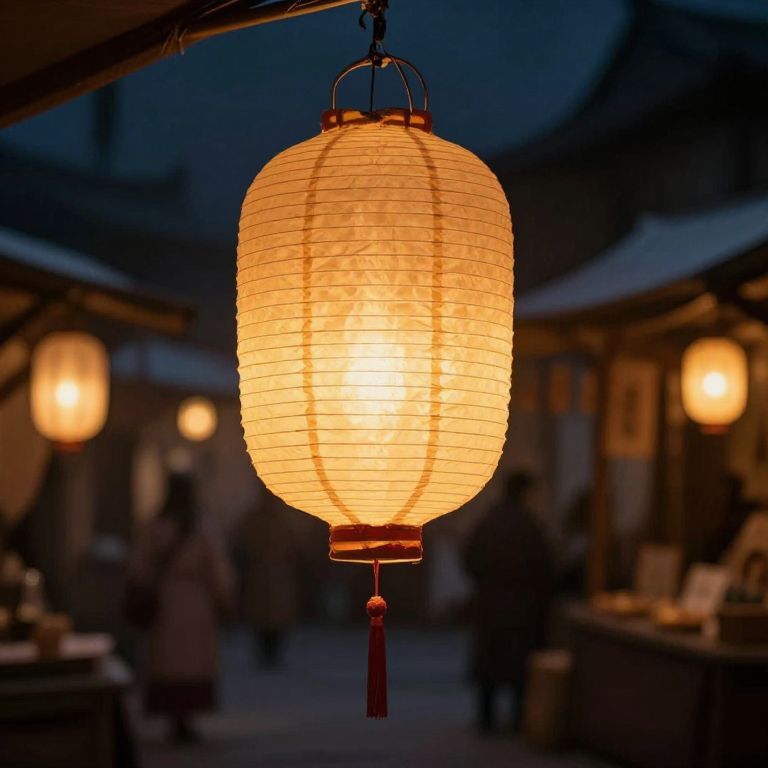 Photograph of a glowing, cylindrical paper lantern hanging in the center of a dimly lit, outdoor market at night. The lantern, illuminated with a warm, orange light, has horizontal ridges and a small red tassel hanging from the bottom. The background is blurry, featuring silhouetted figures and other lanterns, creating a cozy, festive atmosphere. The market stalls are partially visible with dark, muted colors, and the deep blue night sky adds to the contrast. The lantern's light casts a soft, inviting glow, highlighting the textures of the paper and the subtle shadows around it.