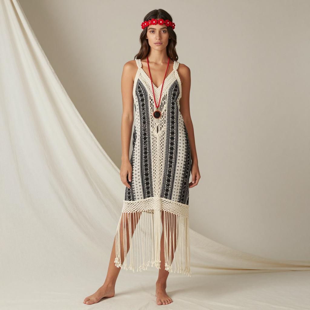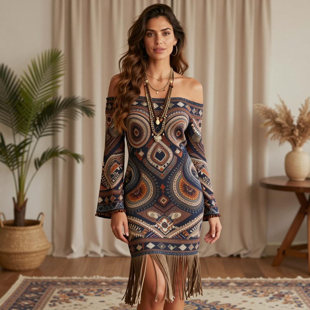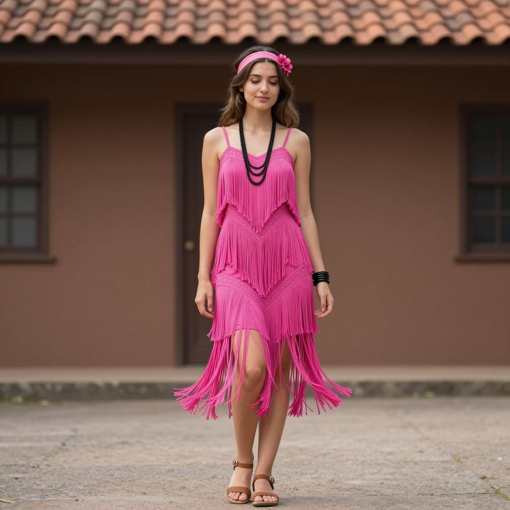 Fringe fuchsia flapper dress, photograph of a young woman standing in front of a brown building with a tiled roof, wearing a bright pink, sleeveless, layered fringe dress, brown sandals, black layered necklaces, black bracelets, pink headband with flower, brown hair, soft sunlight, daytime, paved ground, casual style, frontal view, relaxed expression, outdoor setting