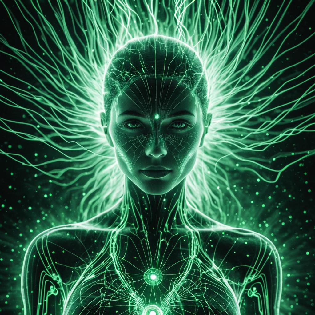 A digitally rendered glowing green sphere with intricate neural network patterns and radiating spikes, floating above a reflective surface in a dark green environment.
