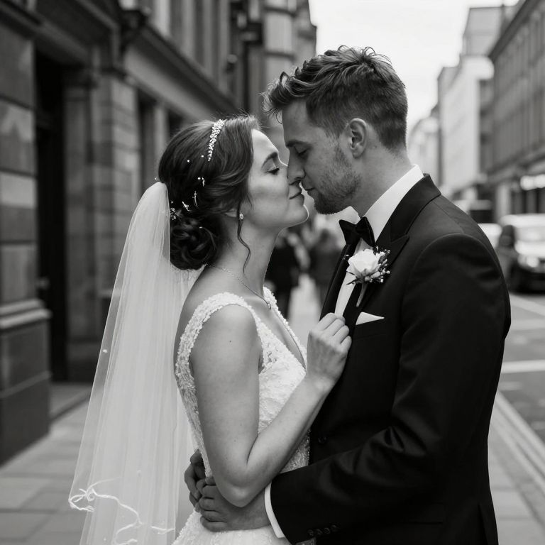 Black-and-white photograph of a bride in lace wedding dress and veil, kissing her bearded groom in a suit, standing on a city street.