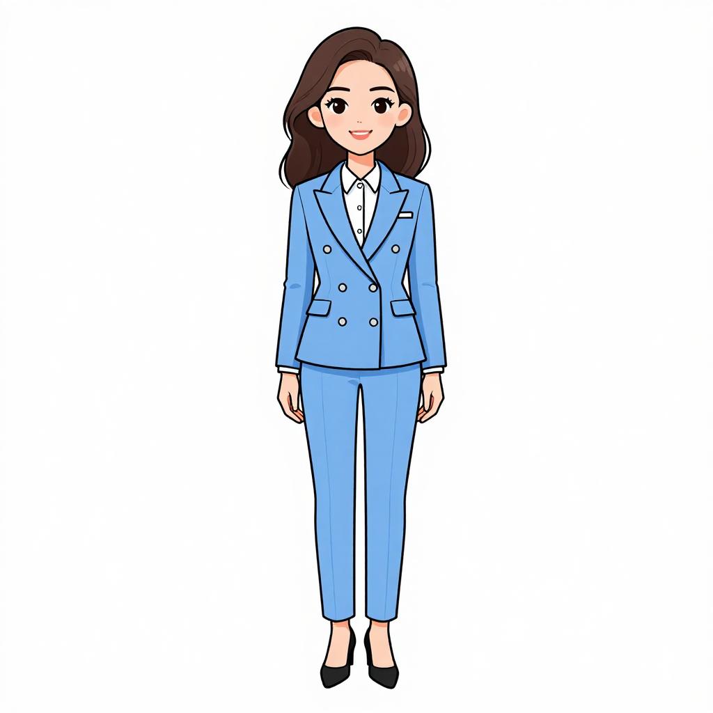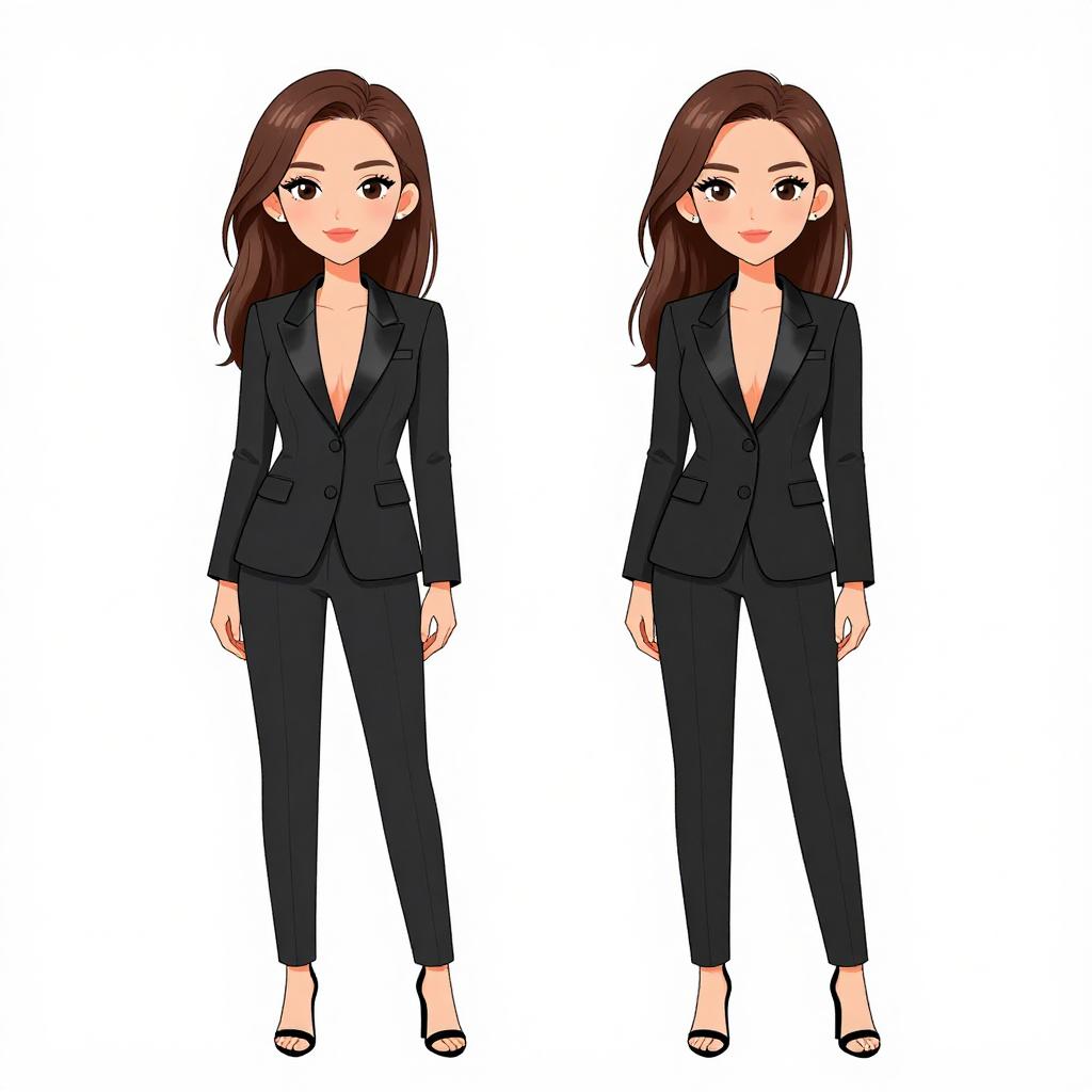 Woman with pretty face and pretty hair. smiling Woman, chic, tailored pantsuit in black, slim fit, single-breasted blazer with satin lapels, straight-leg trousers, deep V-neckline with no blouse, minimalist black stiletto sandals, minimal makeup, simple hairstyle, plain white background. --sref 1467