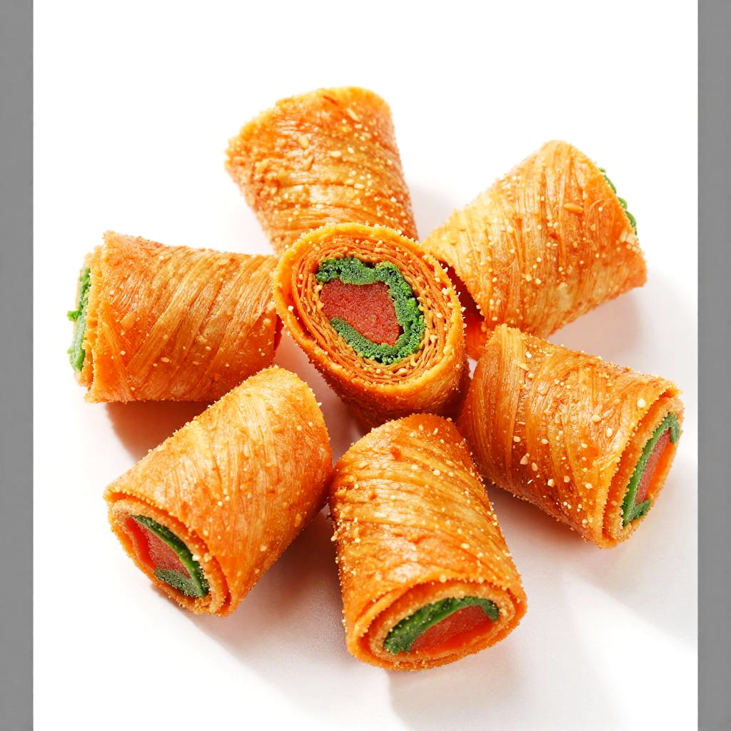 This is a close-up photograph of six brightly colored, rolled-up snacks. They have a vivid orange, slightly crispy texture, with green and red fillings peeking out from the center of each roll. The snacks are arranged in a slightly overlapping, circular pattern against a stark white background, making their colors pop. The image has a gray border on the left and right sides.