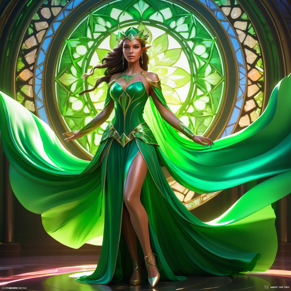 High-definition concept art of a graceful female elf with fair skin and an athletic physique. She wears a flowing, intricately designed green gown with gold accents, surrounded by dynamic, volumetric lighting. Her long green hair flows naturally, complemented by leaf-like hair accessories. The background features an ornate arched window with lush green foliage, enhancing the fantasy atmosphere. The artwork is rendered in 8K resolution, inspired by the styles of Alphonse Mucha, Greg Rutkowski, and Artgerm.