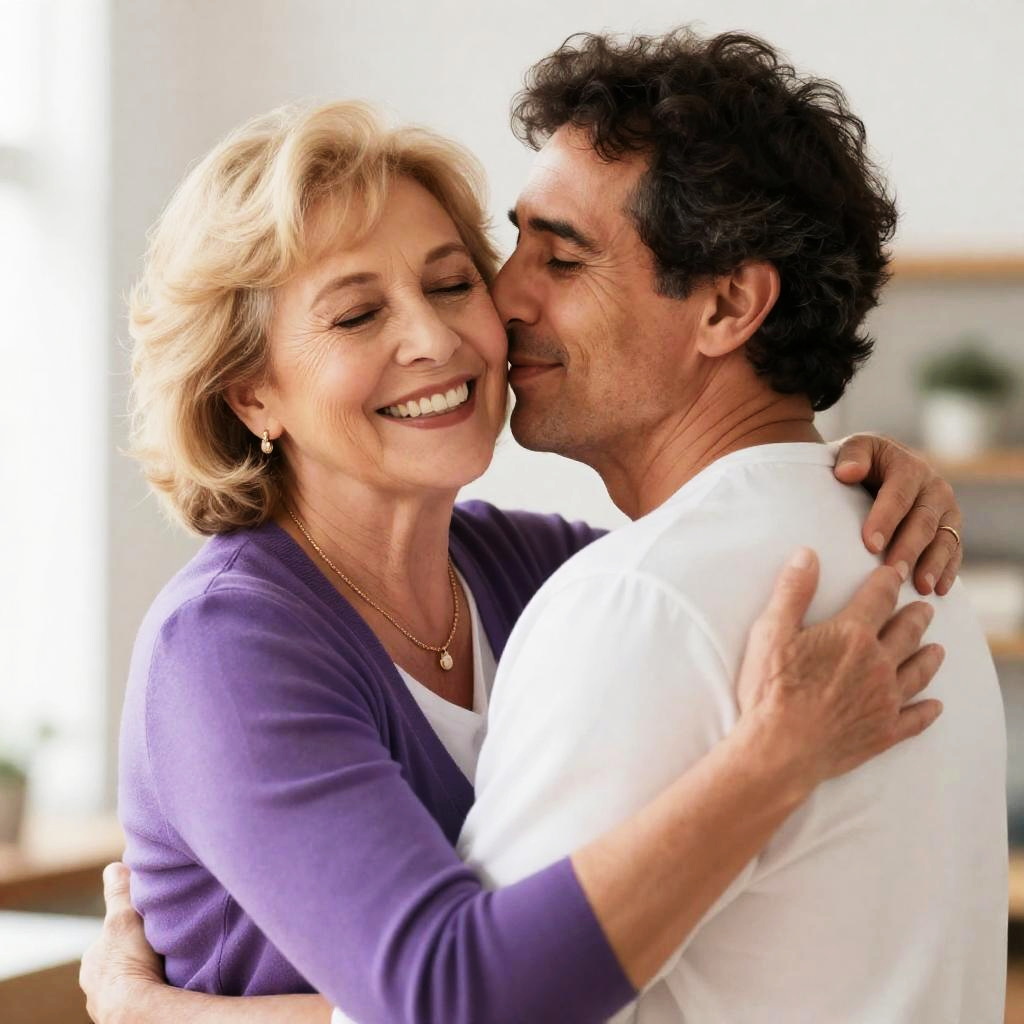 Photograph of a middle-aged man and woman in bed. Woman with curly brown hair, pink top, leaning on man's chest. Man with dark hair, striped shirt, eyes closed, arm around woman. Soft lighting, white headboard, intimate pose. Woman smiles softly.
