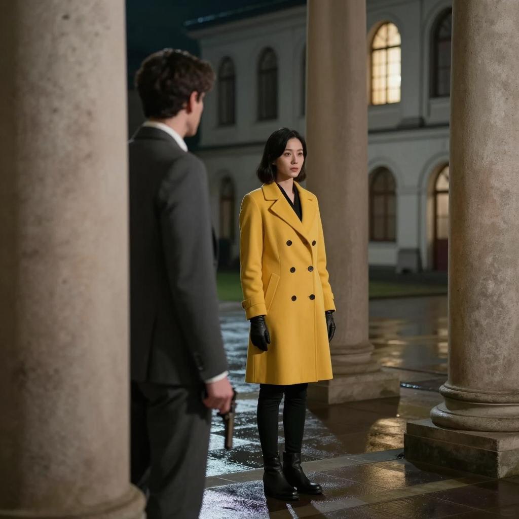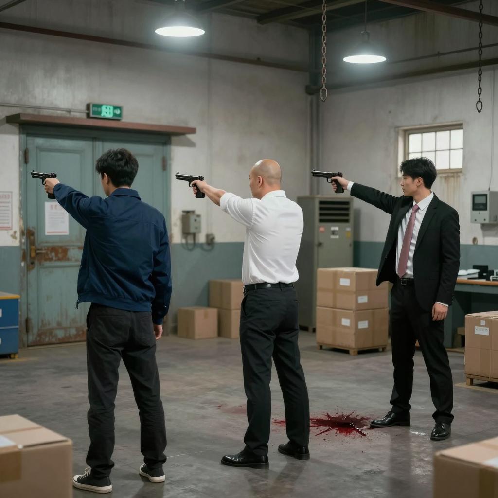Three men in an industrial warehouse. One in blue jacket, black pants, pointing a gun left. Bald man in white shirt, black pants, pointing a gun center. Man in black suit, pink tie, pointing a gun right. Blood on floor. Background: old doors, covered equipment, crates. Overhead lights. Suspended chains. Smaller window on right wall.