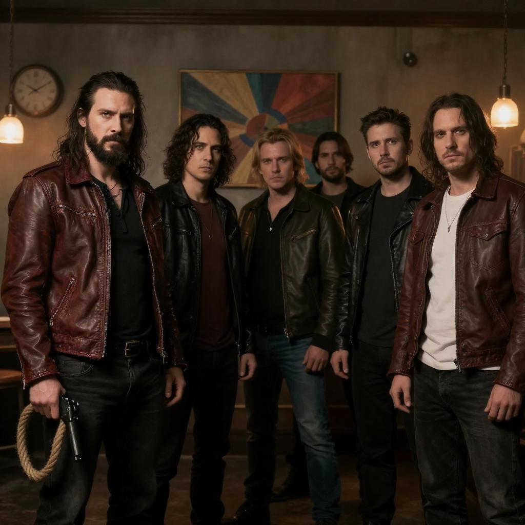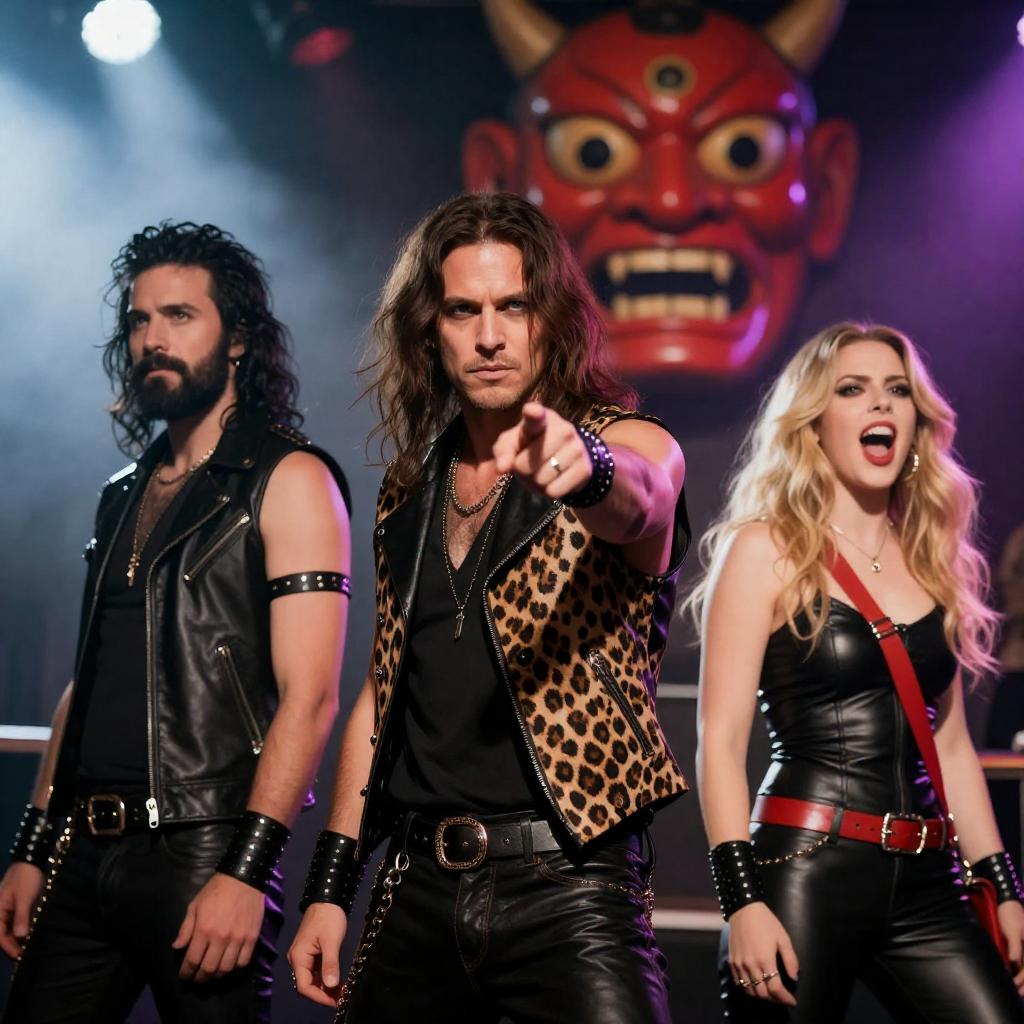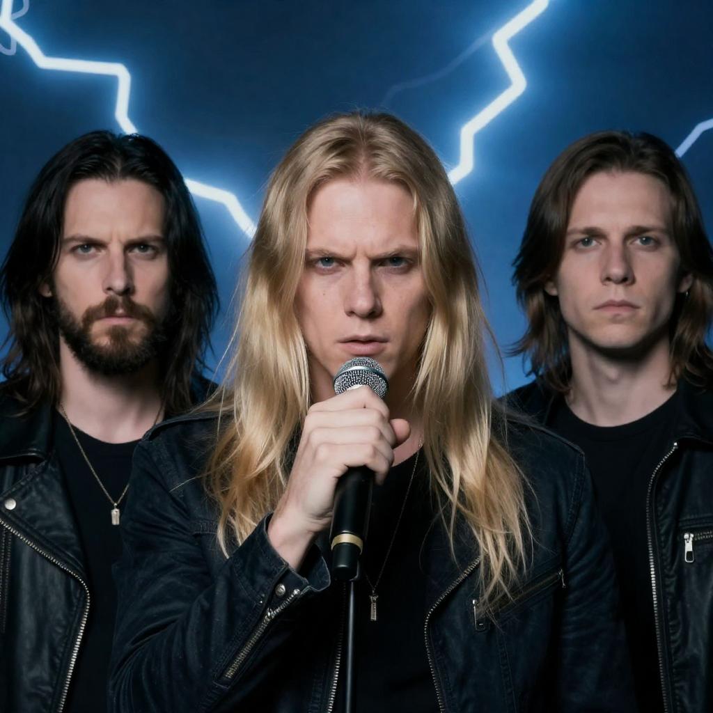 Photograph of three rock musicians. Central figure with long blonde hair, intense expression, holding a microphone, wearing a dark jacket. Left figure with dark hair, beard, intense gaze. Right figure with brown hair, neutral expression, wearing a dark shirt. Blue lightning background. Musicians close together, centered.