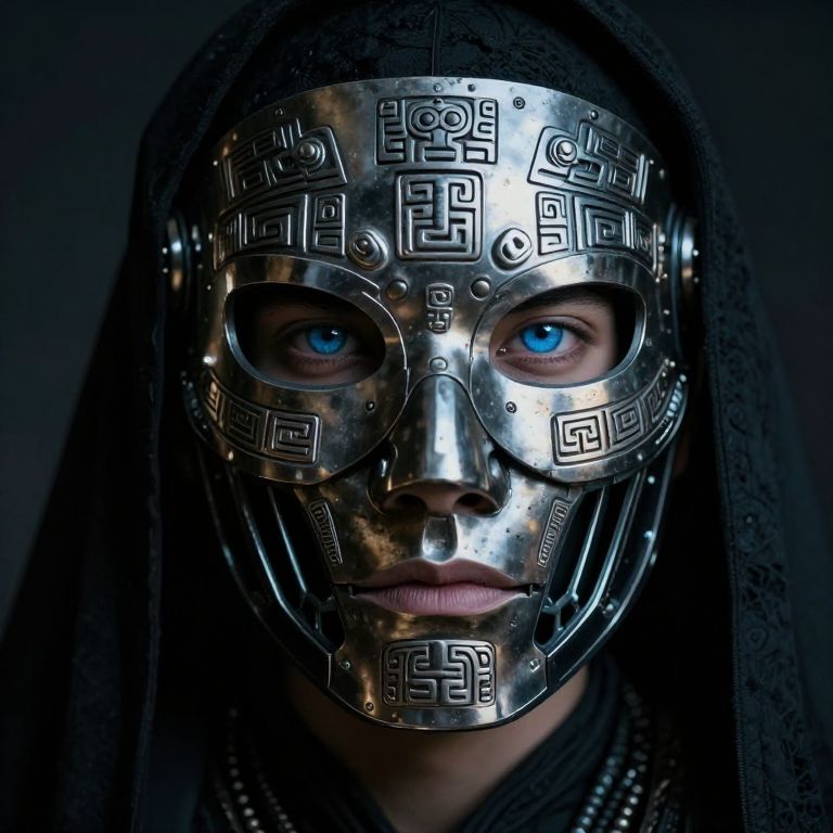 A captivating photorealistic portrait captures a figure enshrouded in darkness, with sharp facial features obscured beneath an advanced metallic cybernetic mask etched with intricate designs reminiscent of ancient cultural iconography. This striking visage reveals piercing blue eyes that convey both sagacity and malevolence as they fixate into the horizon. The image exudes an aura of suspense and curiosity, seamlessly merging futuristic high-tech aesthetics with the timeless mystique of indigenous heritage to forge a richly symbolic visual tale.