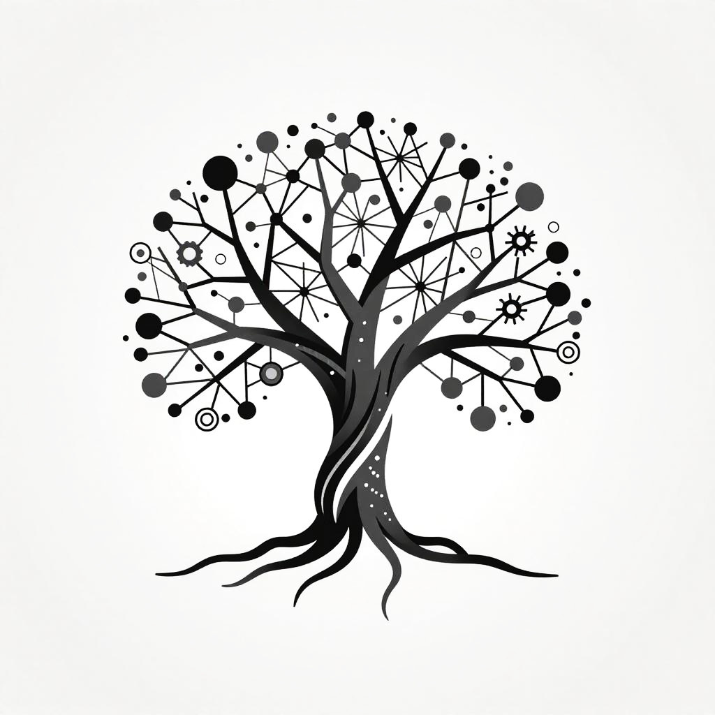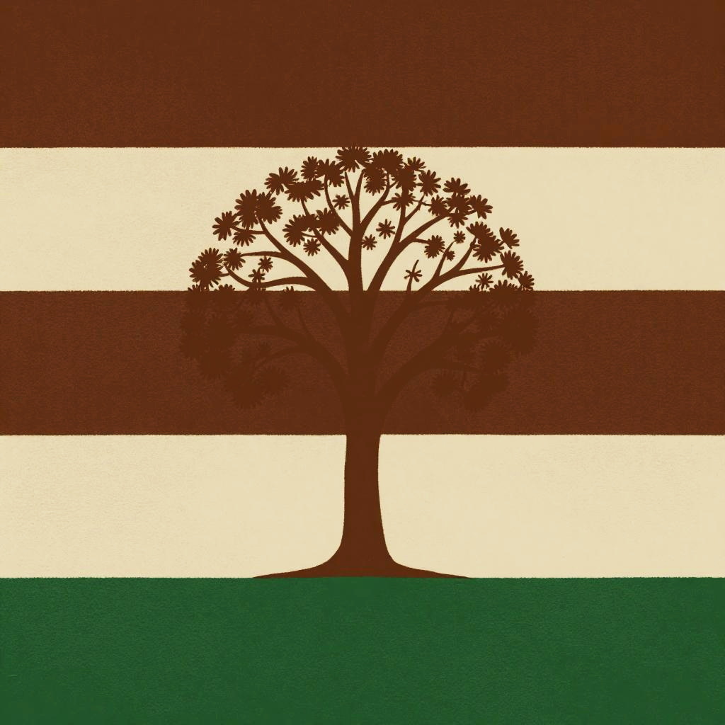 Create a flag with horizontal stripes in earthy tones of brown, beige, and green, featuring an abstract tree silhouette in the center, conveying harmony with nature, rendered in a textured painterly style.