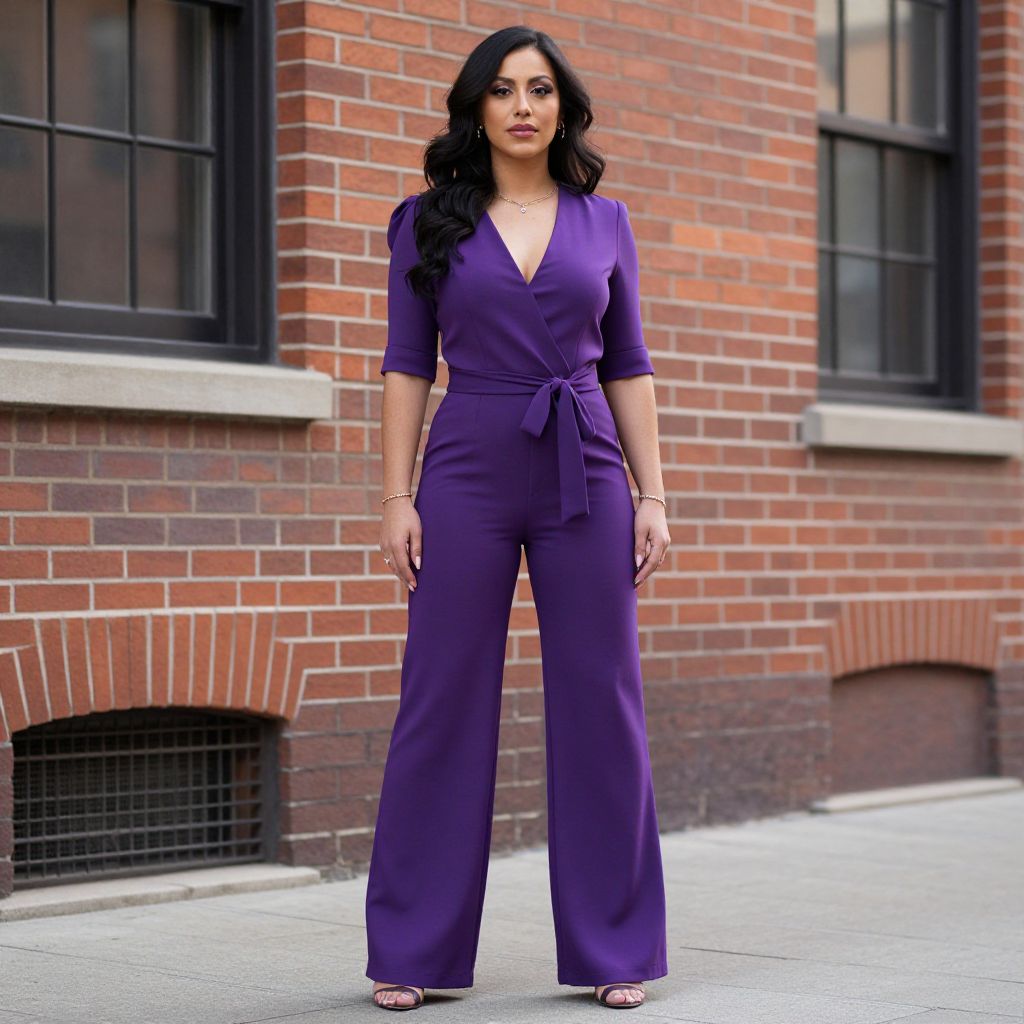 Photograph of a woman with long black hair in a deep purple, wrap-style jumpsuit with a tied waist, standing against a red brick building with