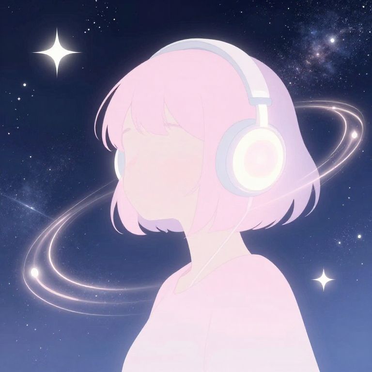 Anime girl wearing headphones floating in a dreamy cosmic environment, stars and galaxies swirling around, ethereal glowing headphones with light trails, minimalist pastel palette, serene expression, surreal and imaginative digital painting.