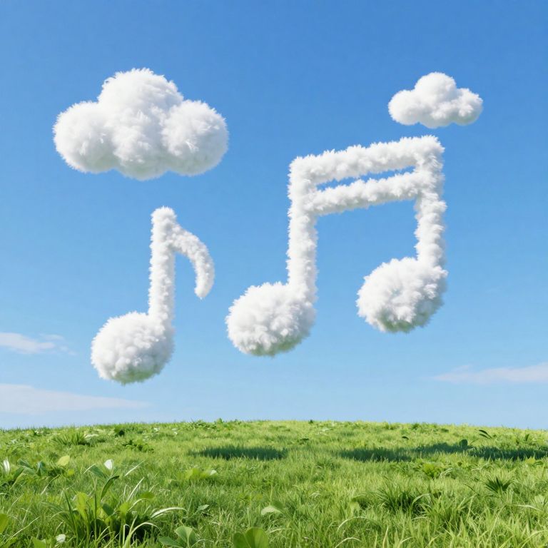 A serene 3D-rendered landscape features fluffy white clouds shaped like musical notes floating against a vibrant blue sky, casting soft shadows over a lush green field that seems to hum in harmony with the celestial melodies.