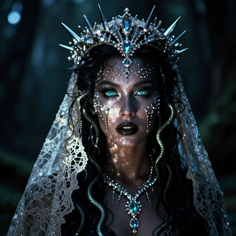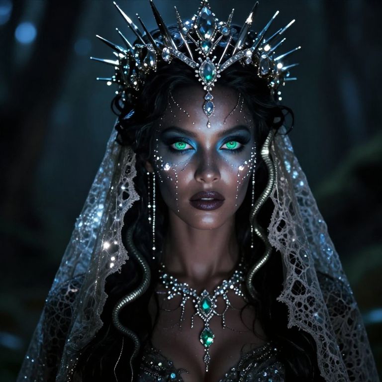 ArsMovieStill, 80s Fantasy Movie Still, In the depths of a mystic reverie, a dark-skinned enchantress materializes, her presence a whispered secret in the velvet darkness, Her eyes, like shattered emeralds, glimmer with an unholy light, as if the very essence of the forest has been distilled into their piercing gaze, A tattered, lace-like veil, a gossamer whisper of forgotten dreams, clings to her skin like a damp, moonlit mist, casting an eerie, silvered glow across her features, The light that bathes her is a crazed, flickering thing, a mad dance of sunbeams and shadowy tendrils that twist and writhe like living serpents around her face, Upon her head, a crown of jagged, chrome splinters reigns, its diamonds flashing like a riot of fireflies on a summer's night, as a diamond-encrusted necklace slithers around her neck like a glittering, venomous serpent, A face ornament, a delicate, bejeweled latticework, sprawls across her cheeks and forehead like a mad, its silver chains and diamonds glinting with a manic, fevered light, as if the very fabric of reality has been torn asunder to reveal a glimpse of the surreal, dreamlike realm that lies beyond, And yet, amidst this maelstrom of color and light, the enchantress remains, a serene, unyielding presence, her gaze a cold, dark mirror that reflects the very soul of the viewer, drawing them in with an otherworldly allure, a siren's call that beckons them deeper into the heart of the madness
