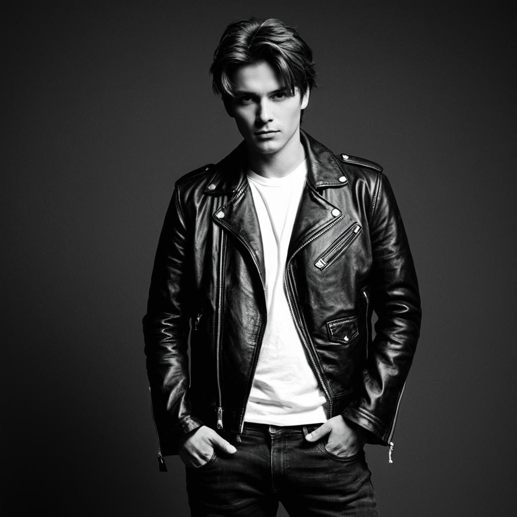 Black and white studio portrait of a young man with tousled short hair wearing a black leather jacket over a white t-shirt and dark jeans. He stands confidently against a plain monochrome background with hands in pockets.