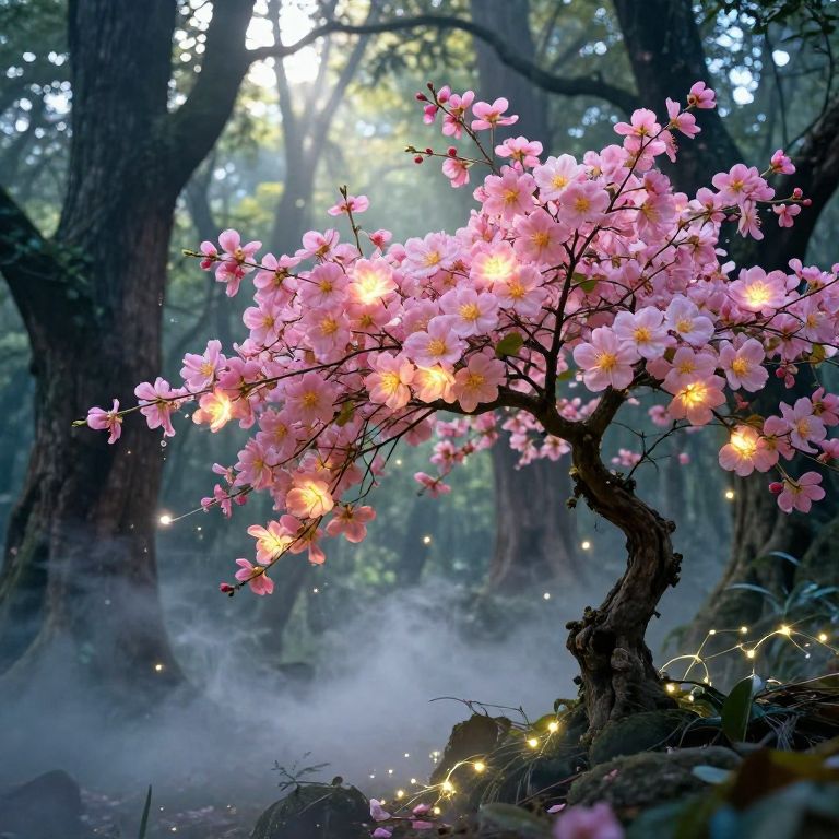 Photograph of a pink cherry blossom tree with glowing fairy lights, set against a misty forest background with towering trees.