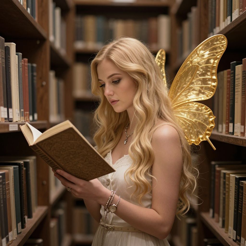 Enchanted library scene featuring a woman with golden butterfly wings reading a book amidst rows of bookshelves, her long blonde hair cascading over her shoulders while she holds the open book with both hands, adorned with delicate bracelets and a watch.