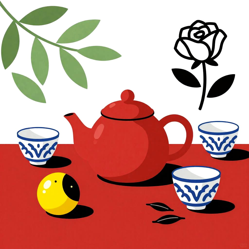 This is a digital illustration of a still life scene. A bright red teapot sits in the center on a red surface, surrounded by a yellow and black spherical object, two blue and white patterned cups, and a few black tea leaves. Green leafy branches with a simple black rose sketch in the background add a natural touch. The overall style is minimalist with bold colors and clean lines.