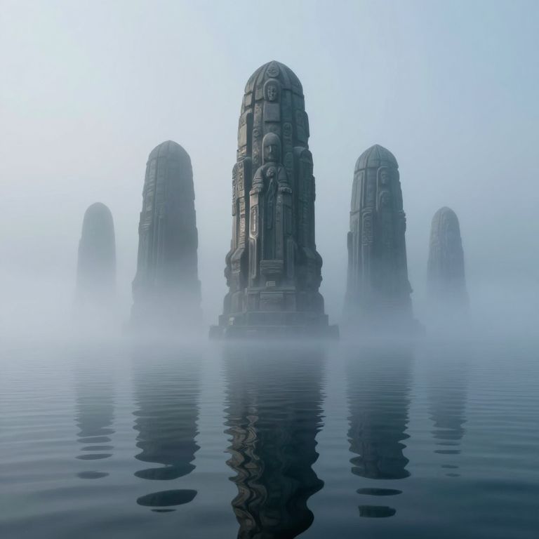 Monolithic sentinels rise from a mist-shrouded sea, their timeless forms casting ethereal reflections that ripple like echoes of forgotten worlds.