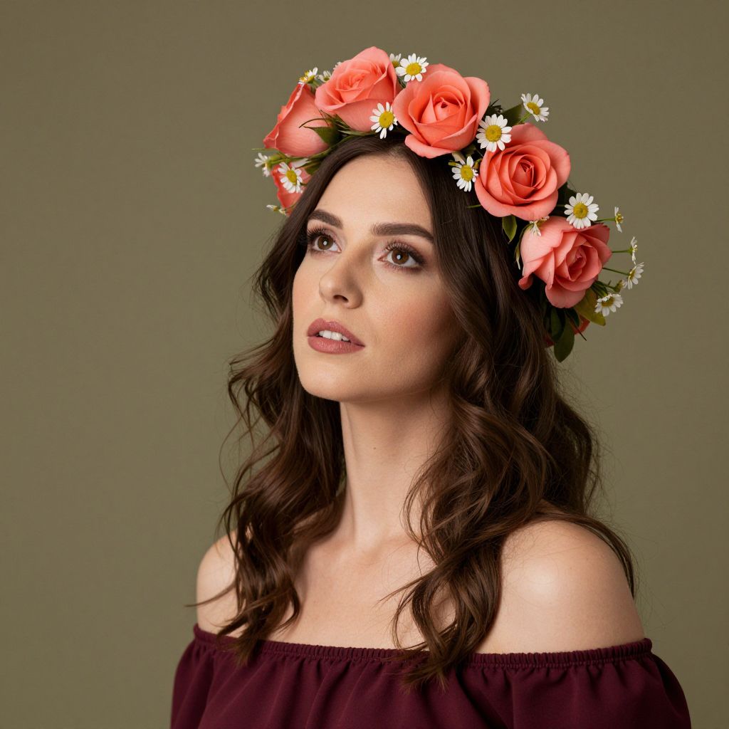Brunette woman adorned with a vibrant floral wreath featuring six coral roses and delicate white daisies, gazing upward against a soft olive backdrop while wearing a deep maroon off-the-shoulder top.