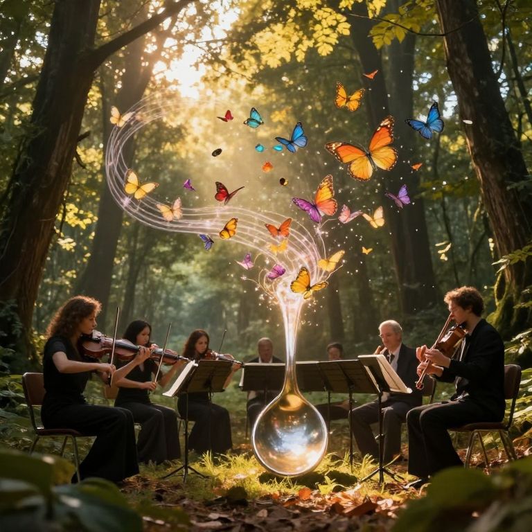 Photograph of string quartet performing in forest, surrounded by colorful butterflies emerging from glowing glass vase, sunlight filtering through trees.