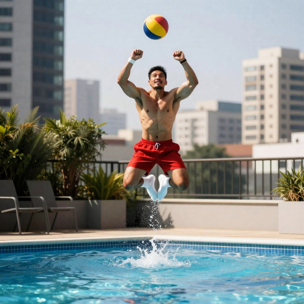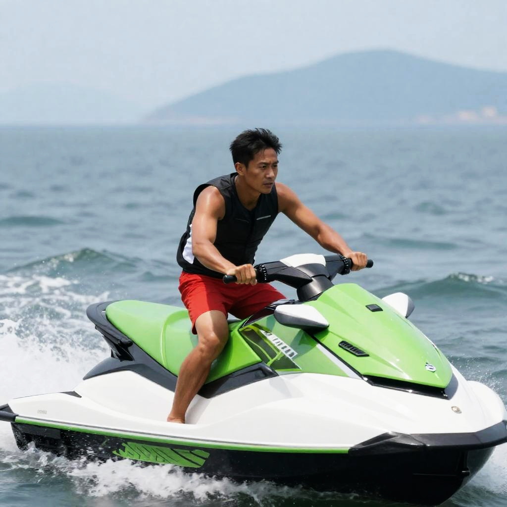 Photograph of a man riding a green and white jet ski, wearing a black sleeveless shirt and red shorts. He has a focused expression, holding the handlebars firmly. White ocean spray surrounds him, with a blue sea and distant mountain in the background. The jet ski is moving fast, creating a dynamic motion.