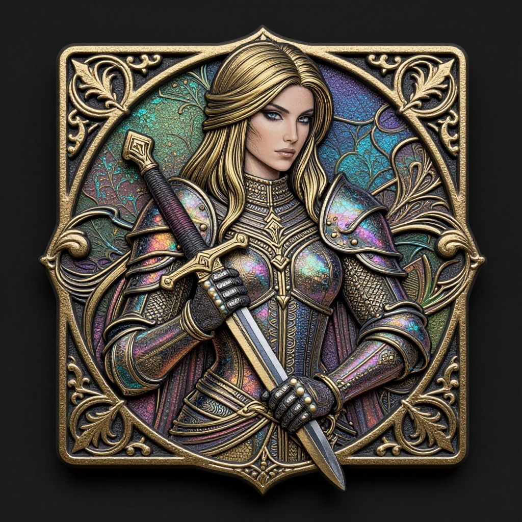 Digital artwork of a blonde, fair-skinned woman in detailed, shiny medieval armor holding a sword. Her expression is stern, with blue eyes and slightly parted lips. The background features a colorful, iridescent pattern within an ornate, golden frame with intricate designs. The armor is highly detailed with metallic textures and reflective surfaces. The image is stylized with a mix of realism and fantasy, showcasing vibrant colors and elaborate patterns. The overall style is reminiscent of high-fantasy art with a focus on both the warrior and her regal, intricate surroundings.
