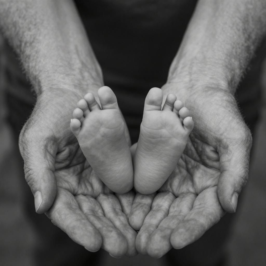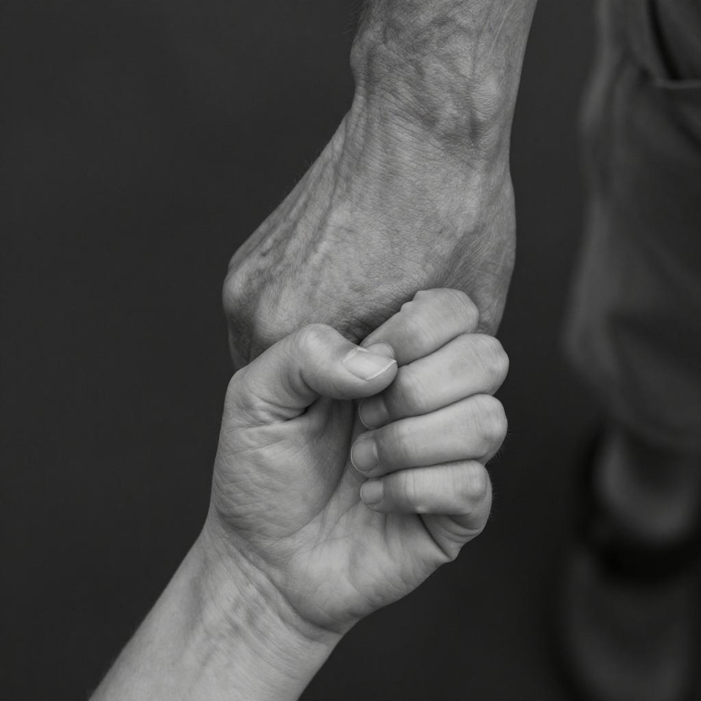 This black-and-white photo shows two hands in a close-up shot against a dark background. The larger hand, with visible wrinkles and a firm grip, is holding the smaller hand's index finger. The lighting is soft, highlighting the texture of the skin. The camera angle is straight-on, with a shallow depth of field, making the background completely blurred. The focus is sharp on the hands.