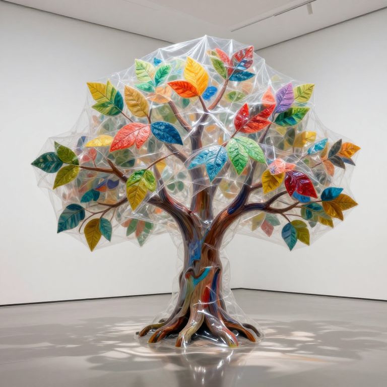 The image showcases a breathtaking art installation in a contemporary museum setting, featuring a whimsical tree made from transparent plastic vinyl and painted with oil paints in a hyperrealistic style. The tree, with its intricate branches and leaves, is adorned with colorful, sugar-coated colors that create a surreal and dreamlike atmosphere. The installation is covered in transparent vinyl, adding a layer of depth and dimension to the artwork. The tree stands on a reflective surface, enhancing the illusion of its transparency and creating a captivating play of light and shadow. The background is a minimalist white wall, which contrasts beautifully with the vibrant colors of the tree, making it the focal point of the scene. The overall composition is balanced and harmonious, with the tree positioned centrally and surrounded by other elements that complement its intricate details. The use of light and shadow, as well as the interplay of colors and textures, creates a sense of depth and realism, making the tree appear almost tangible. This art installation is a testament to the skill and creativity of the artist, blending elements of surrealism, hyperrealism, and contemporary art in a visually stunning and thought-provoking manner.