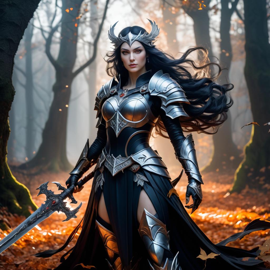 The Morrigan – Goddess of war, fate, and death, portrayed as a mythical figure with glowing eyes and silver armor, wielding a gleaming sword, standing in an ancient forest with fallen leaves and remnants of battles lost.