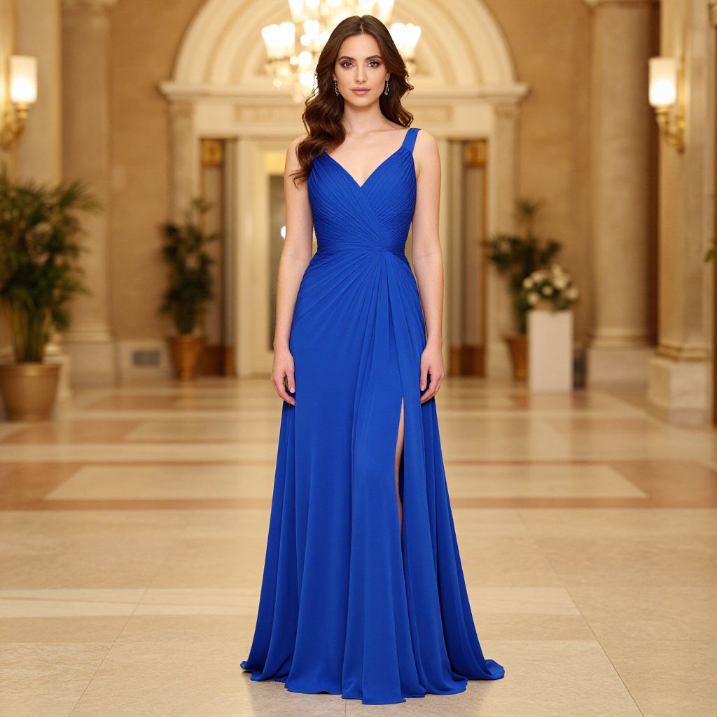 "Slny Formal Dress, woman in a blue dress standing in a hall"