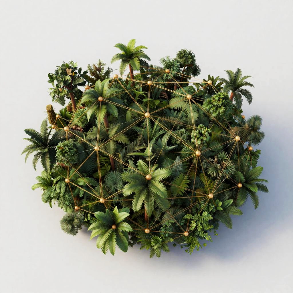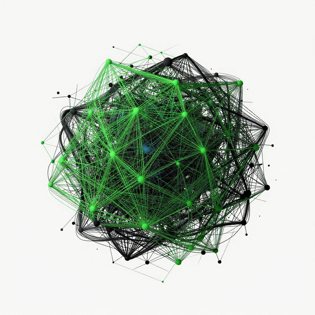 Detailed visualization of a leaf vein structure surrounded by intricate, interconnected network threads illustrating the network effect, depicted in macro photography style, using a bright greens and yellows palette on a clean minimalistic background