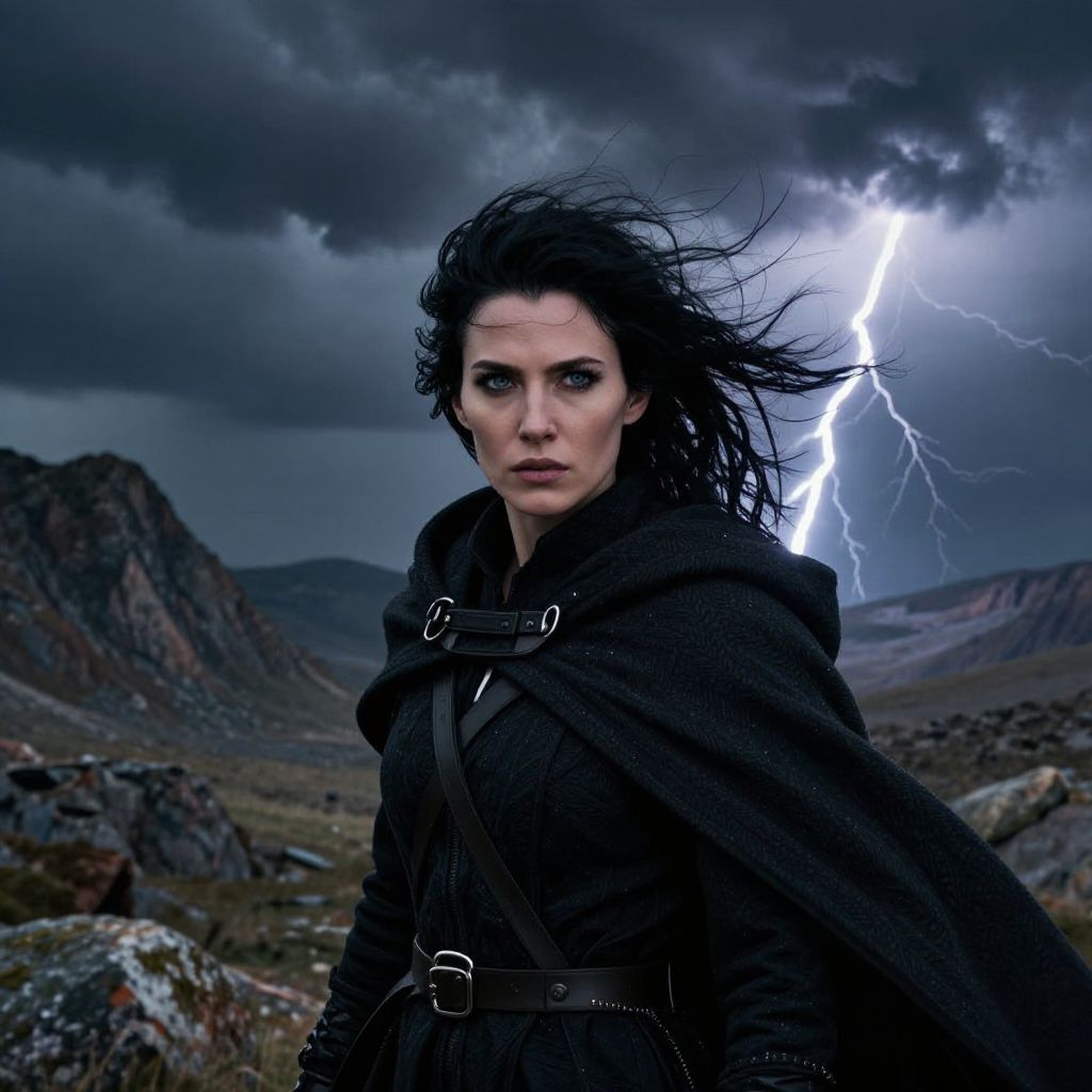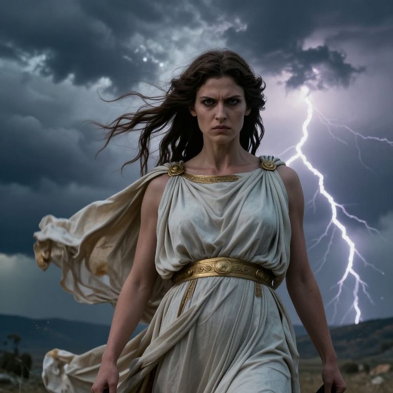 Hera from Greek mythology stands in a storm, with dark clouds and lightning in the background, her robes flying in the wind, Her expression is cold and her eyes are sharp, symbolizing her anger at infidelity, Atmosphere: The cold-toned thunderstorm and storm bring an atmosphere of power and anger, Shooting details: The wide-angle lens shows the strong effect of the storm, and the close-up captures her firm eyes and anger, showing her anger and power