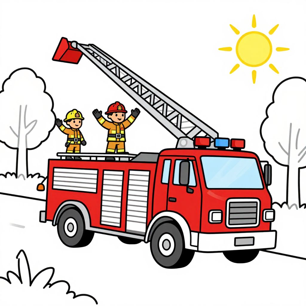 Colorful cartoon drawing of two firefighters in yellow and red uniforms, one with a yellow helmet and the other with a red helmet, standing on a bright red fire truck with a ladder extended. They are raising their arms cheerfully. The fire truck has white stripes, black tires, and a blue light on top. The background features simple, white, cloud-like trees and a yellow sun in the upper right corner. The style is bold and playful, with thick black outlines and vibrant colors.