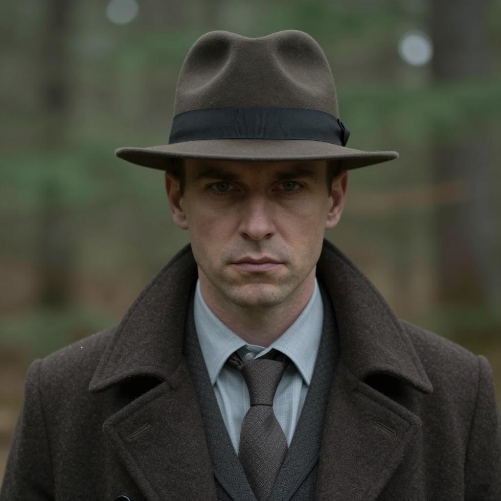 Photograph of a man with fair skin and short brown hair, wearing a dark flat cap, black suit, and white shirt, standing with arms crossed in a dimly lit green room. Two framed pictures on green-paneled wall, white towels hanging on a rack, and a small container on a counter in the background. Intense facial expression.