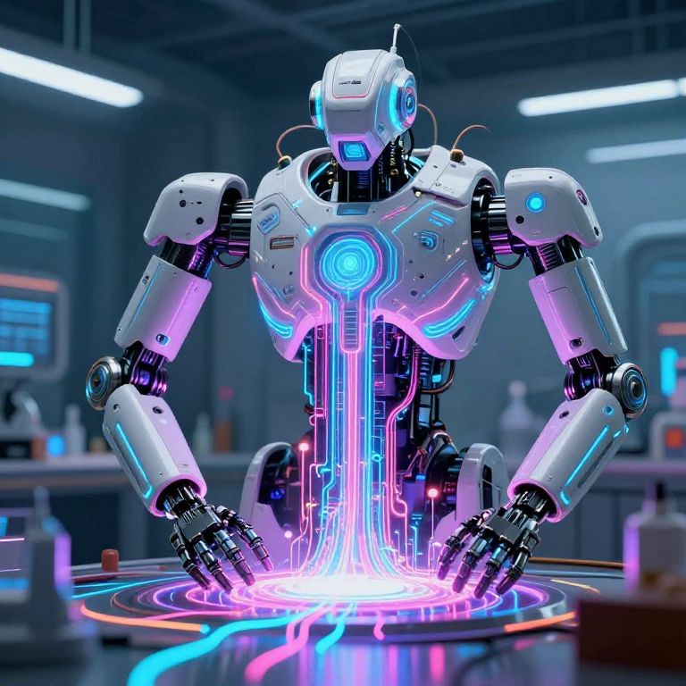Digital art of a glowing white robotic figure with neon blue and pink accents, sitting on a futuristic circular platform in a high-tech laboratory.