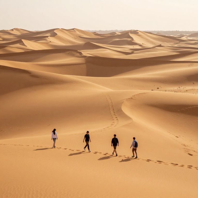 Photograph of five silhouetted hikers walking across vast, sunlit golden sand dunes with footprints leading through the desert landscape.