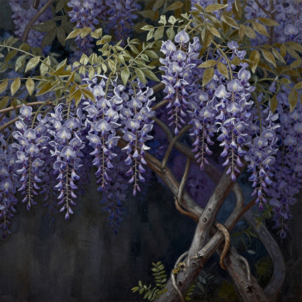 (wax art:1.6), Wisteria tree, (( Dark colors, intricate details, realistic style, tar paintings, dark paintings, digital illustrations, mixed media pieces, deep shadows ))