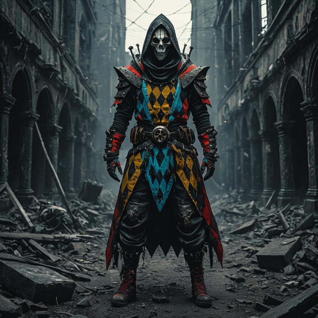 Full body portrait of an apocalyptic harlequin cultist wearing a colorful diamond-patterned costume with spiked armor and a skull mask. The figure stands amid a grimdark, ruined urban environment with destroyed buildings and debris surrounding them. The image features cinematic lighting and sharp focus, created in a digital art style reminiscent of Zdislav Beksinski, rendered with Unreal Engine 5 and Octane for high detail and dramatic atmosphere.