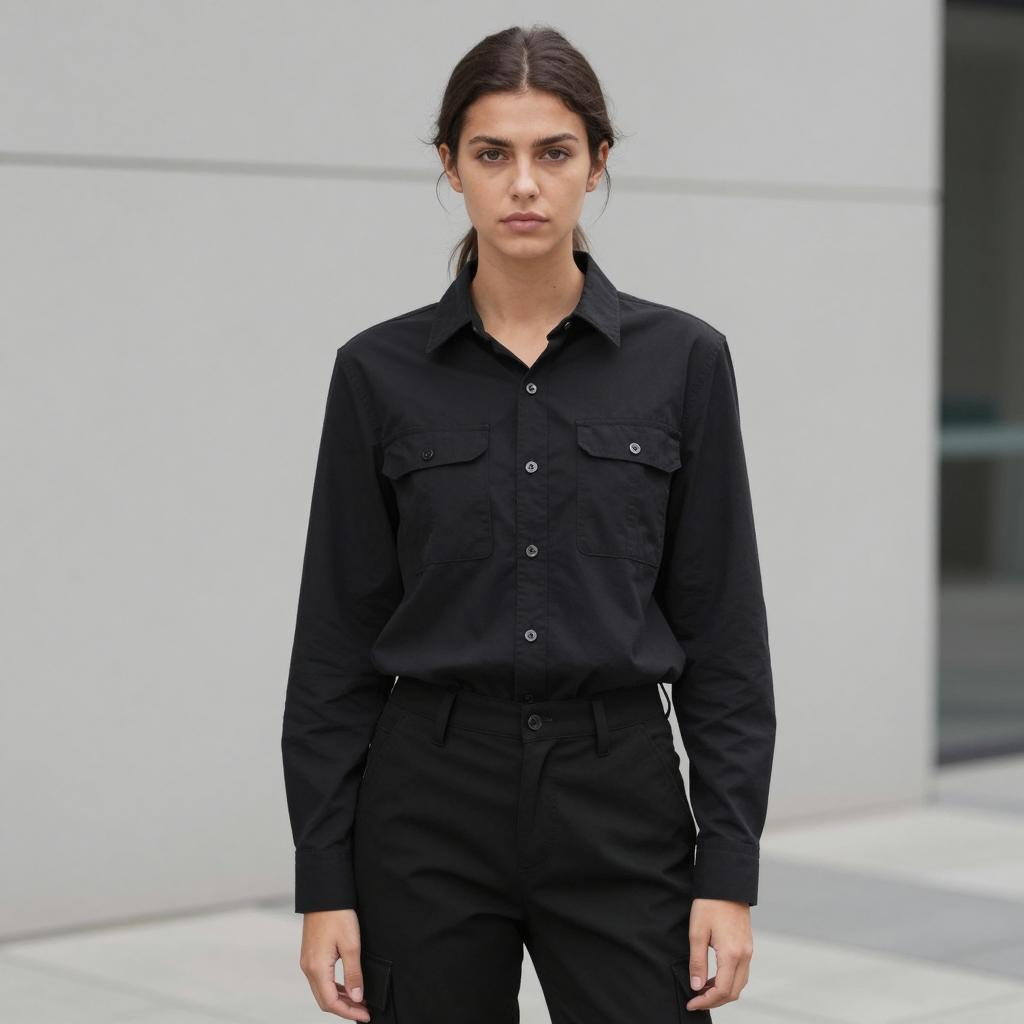 White casual dress, photograph of a young woman standing against a plain white wall, wearing a loose white button-up dress, hands in pockets, black shoulder bag, brown hair tied back, neutral expression, light skin, casual style, minimalist background, natural light, daytime, flat colors, slight shadow on the ground, standing posture, minimal accessories, modern casual look