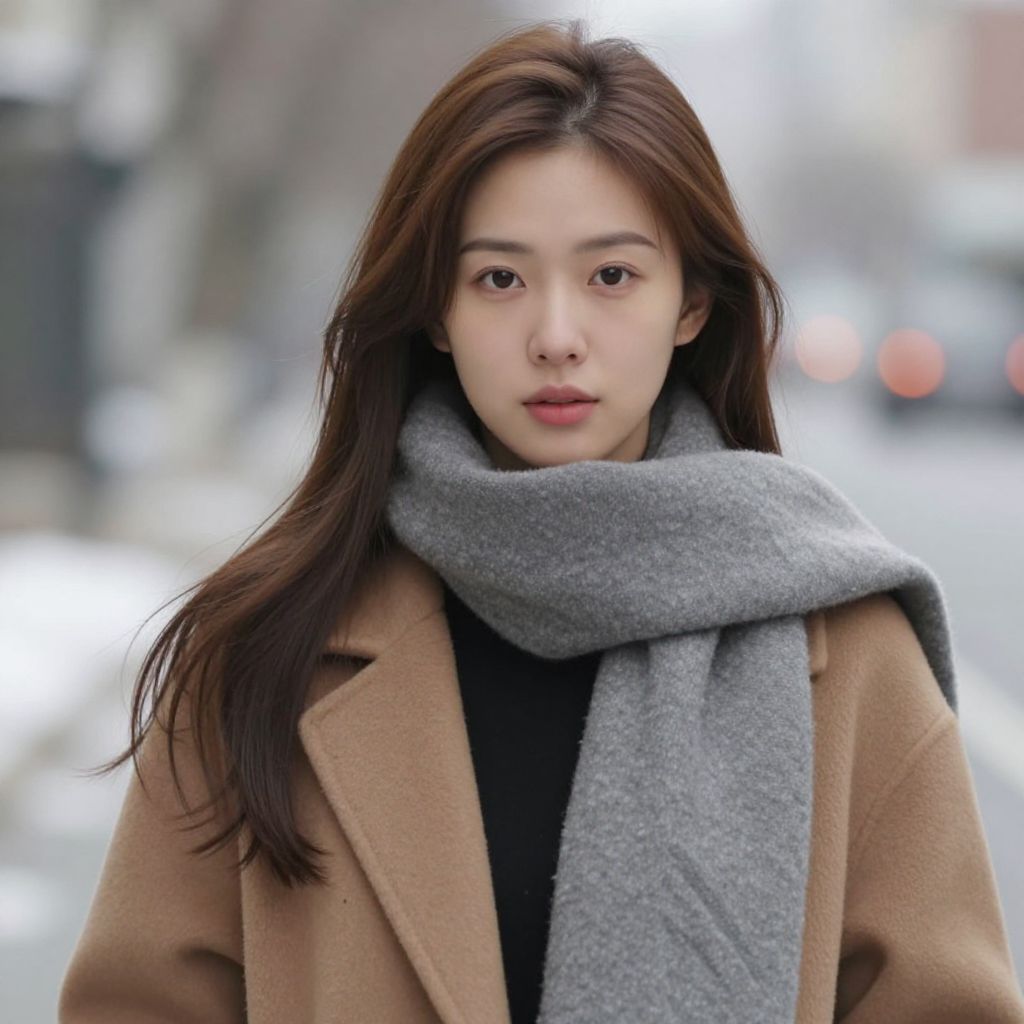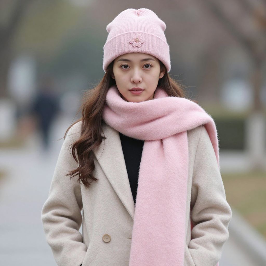 Photograph of an Asian woman with long, wavy brown hair, standing on a blurred, outdoor pathway. She wears a light pink knit beanie with a small, embroidered logo, a thick pink scarf, and a beige, textured coat over a black top. Her expression is neutral, and she gazes directly at the camera. The background shows out-of-focus trees and a sidewalk, with a few indistinct people in the distance. The overall color palette is soft and pastel, with an emphasis on pink and beige. The image has a shallow depth of field, focusing sharply on the woman while the background is blurred.