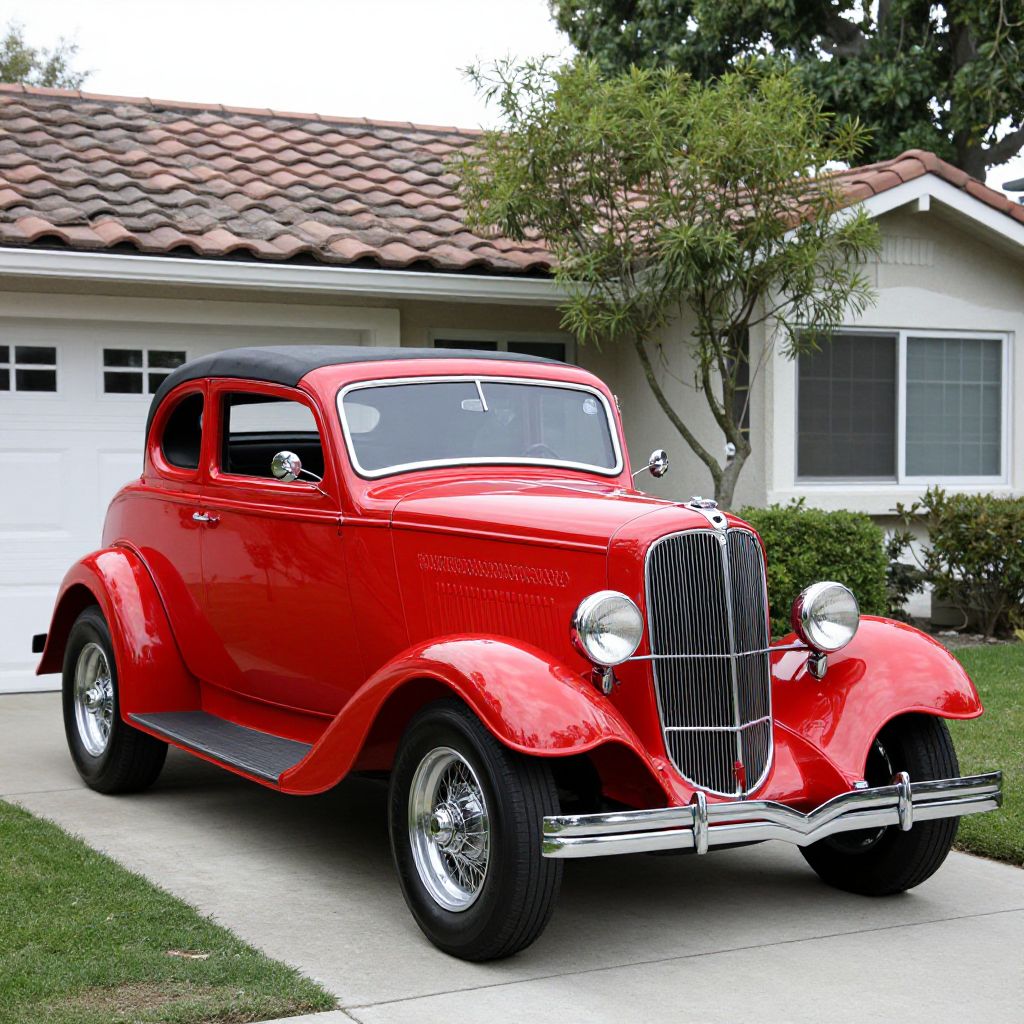 Photograph of a shiny red vintage 1940s car with black hood and trim, parked on a suburban driveway, in front of a white house