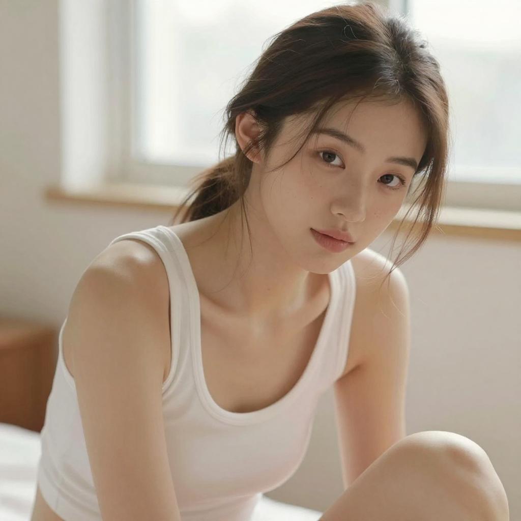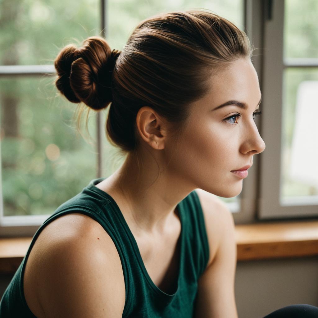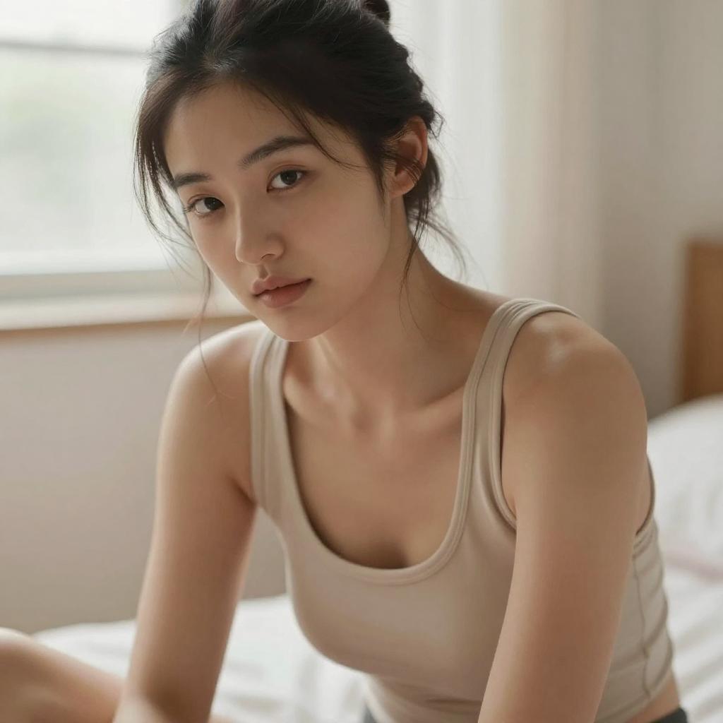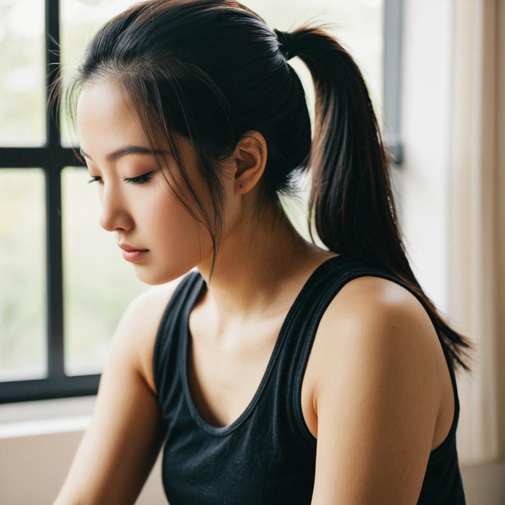Soft-focus close-up portrait of a young fit woman sitting and leaning slightly forward, light Asian woman with straight dark hair and delicate features, wearing a simple white tank top, hair pulled back into a neatly tied bun, gentle expression as she looks slightly downward past the camera, bright natural window light creating a creamy blurred background, warm tones, lifestyle portrait photography