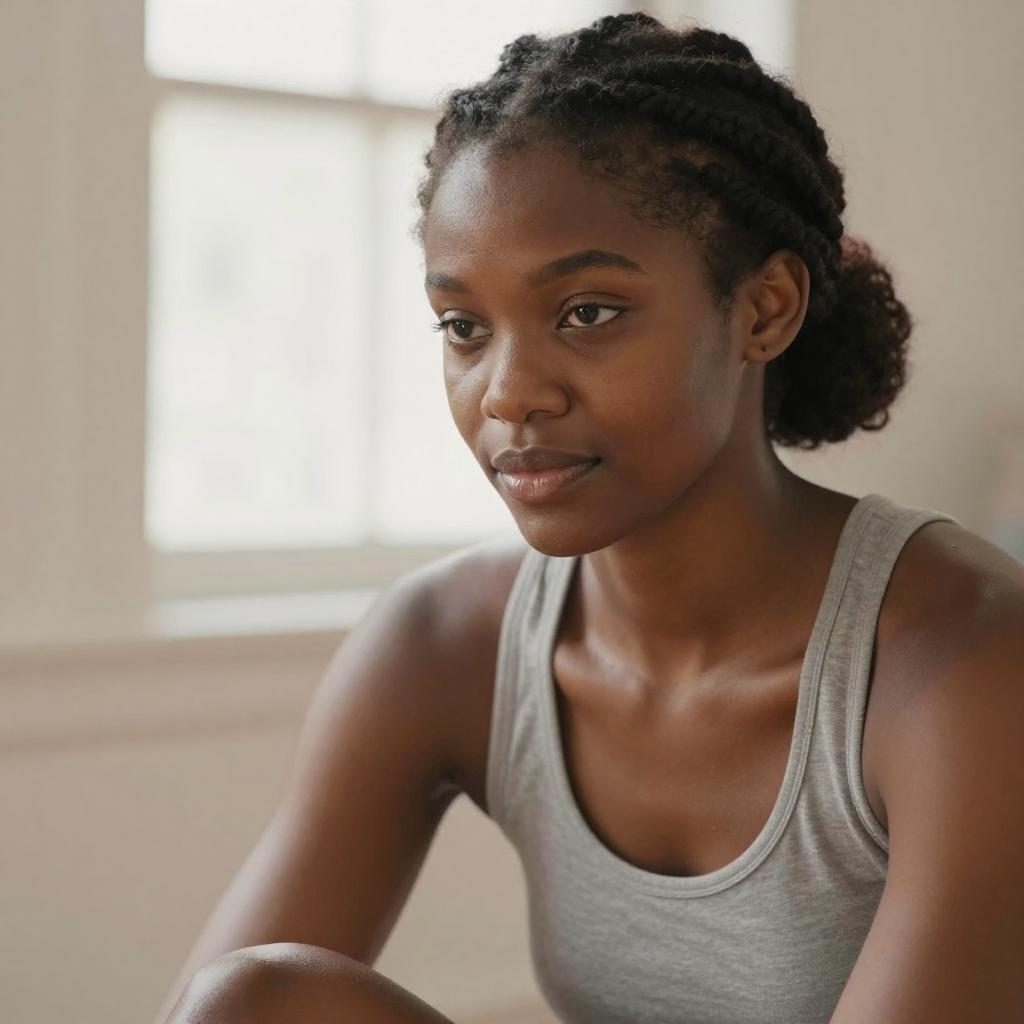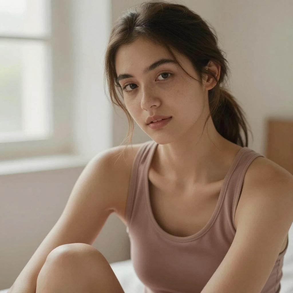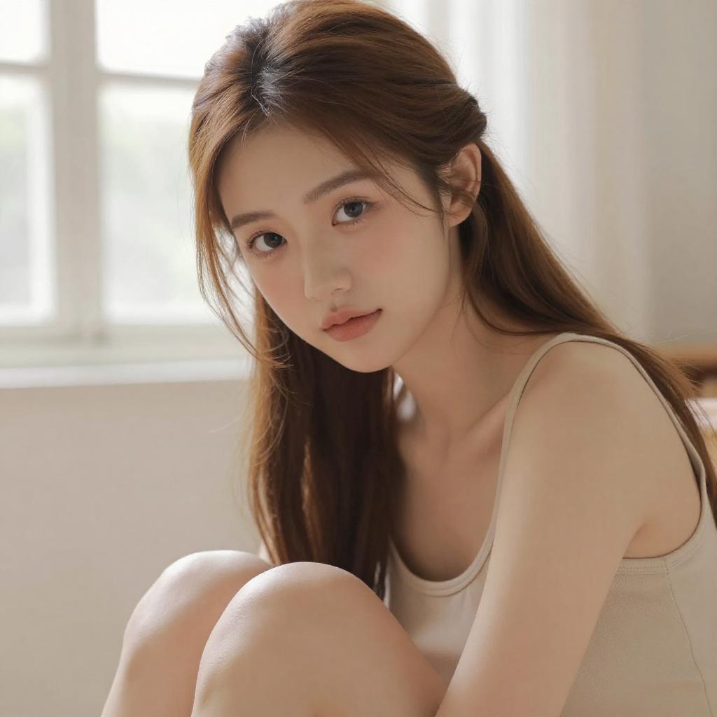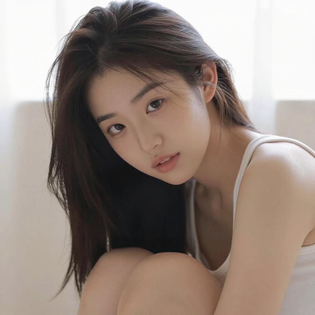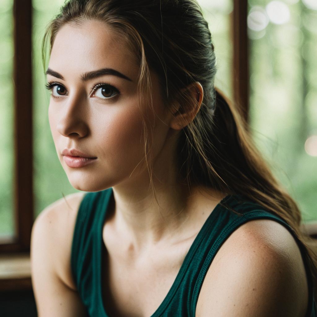 Soft-focus close-up portrait of a young fit woman sitting and leaning slightly forward, light Asian woman with straight dark hair and delicate features, wearing a simple white tank top, hair pulled back into a neatly tied bun, gentle expression as she looks slightly downward past the camera, bright natural window light creating a creamy blurred background, warm tones, lifestyle portrait photography