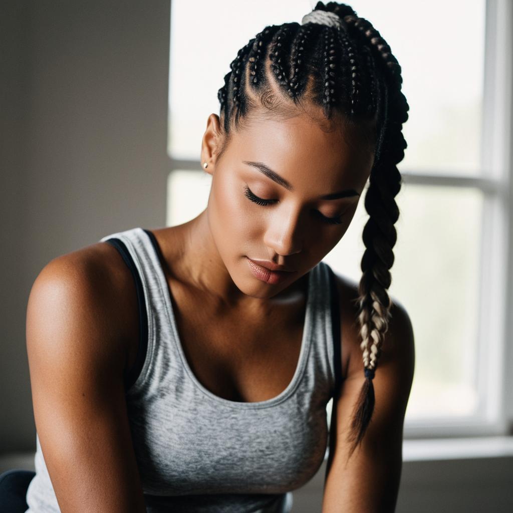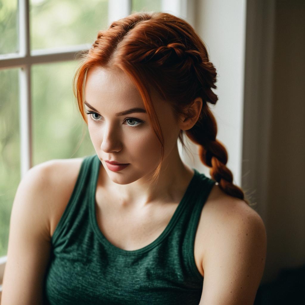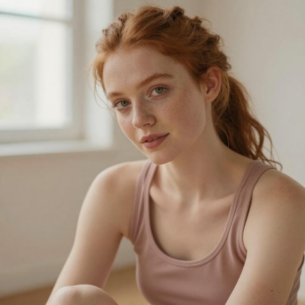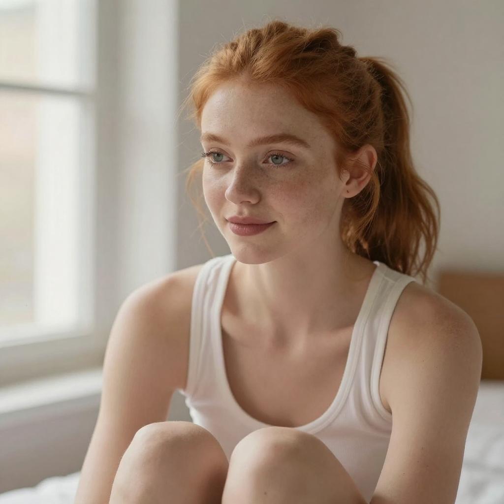 Soft-focus close-up portrait of a young fit woman sitting and leaning slightly forward, light Asian woman with straight dark hair and delicate features, wearing a simple white tank top, hair pulled back into a neatly tied bun, gentle expression as she looks slightly downward past the camera, bright natural window light creating a creamy blurred background, warm tones, lifestyle portrait photography