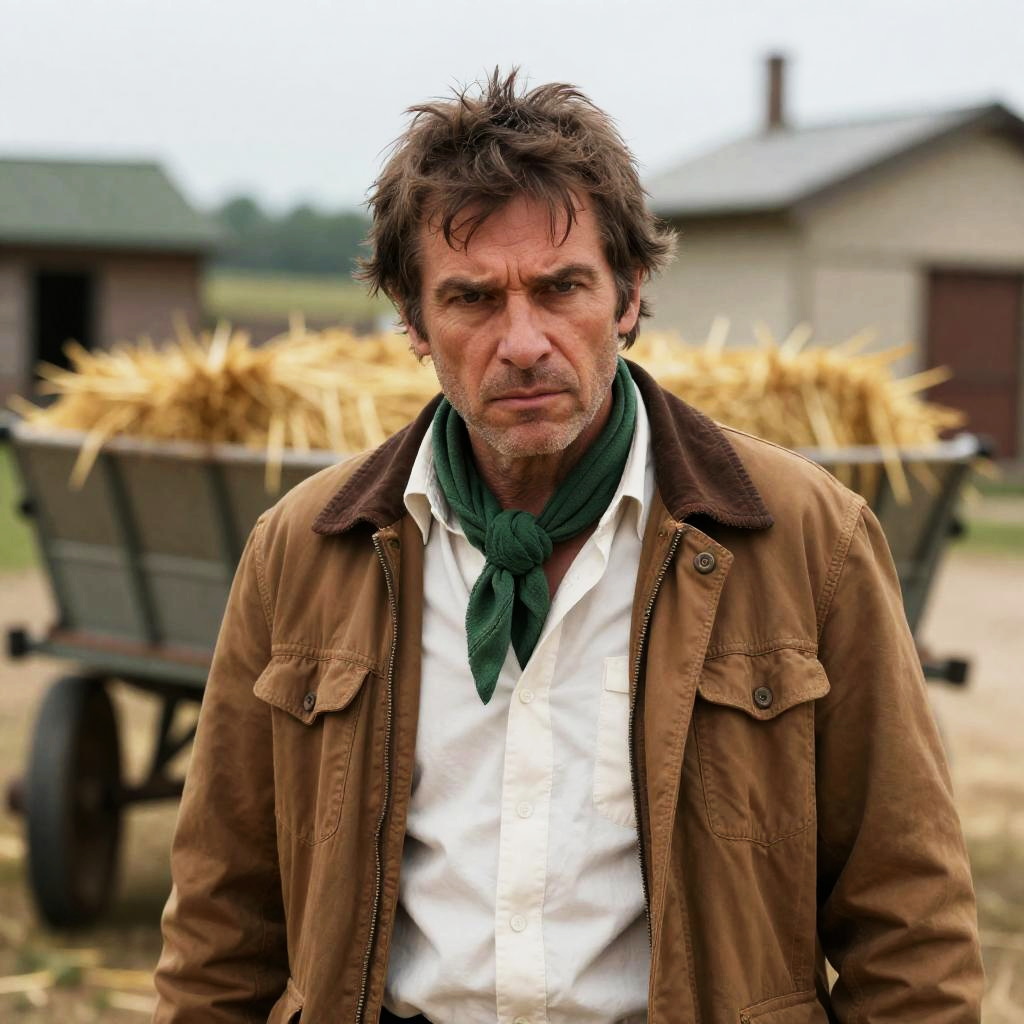 Photograph of a middle-aged man with disheveled brown hair, intense expression, wearing a brown jacket over a white shirt with a green scarf, standing in a rustic setting. Background includes a hay-filled wagon and blurred buildings.