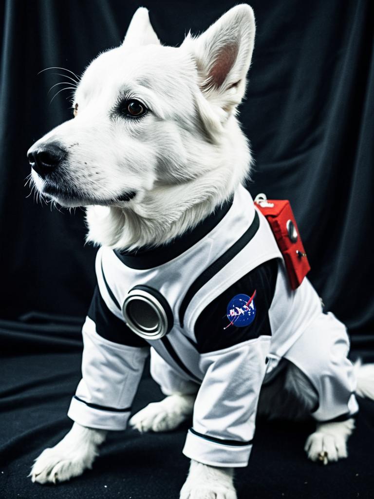 A white dog wearing a detailed NASA astronaut costume, complete with a NASA patch on the sleeve and a red backpack accessory. The dog is seated against a black backdrop, looking attentively to the side, portraying a space-themed cosplay.