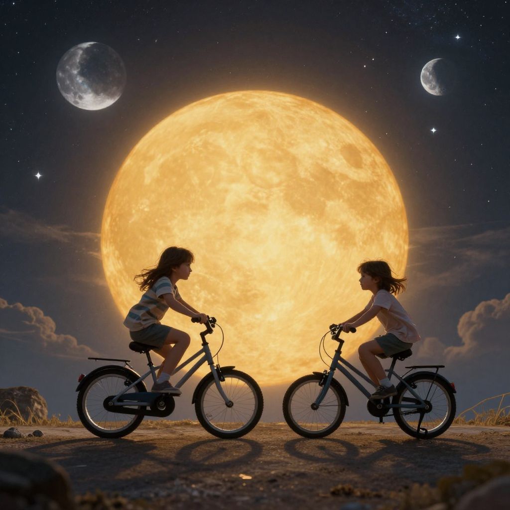 In a surreal twilight realm where gravity bends and dreams take flight, two children pedal their bicycles against the backdrop of a golden sun and scattered moons, embodying the boundless freedom and timeless wonder of childhood amidst the cosmic dance of existence.
