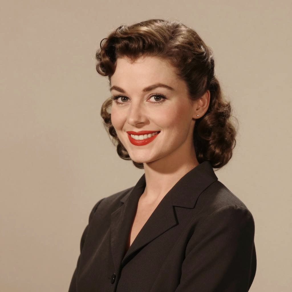 Black-and-white photograph of a young woman with short, wavy dark hair leaning on a large tree branch. She wears a striped short-sleeve shirt and dark high-waisted pants. The image features a classic Hollywood vintage style with blurred tree branches and a cloudy sky in the background. The woman smiles gently while looking directly at the camera.