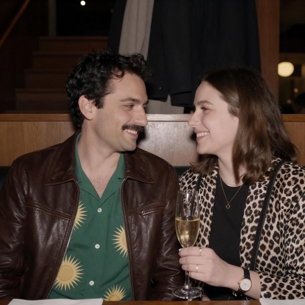 Photograph of a man and woman sitting closely together in a dimly lit restaurant. The man has short, dark hair, a thin mustache, and wears a brown leather jacket over a green, sunburst-patterned shirt. The woman has shoulder-length brown hair, wears a black and white leopard print jacket, and holds a champagne flute. Both smile at each other. Background includes wooden stairs and hanging jackets.